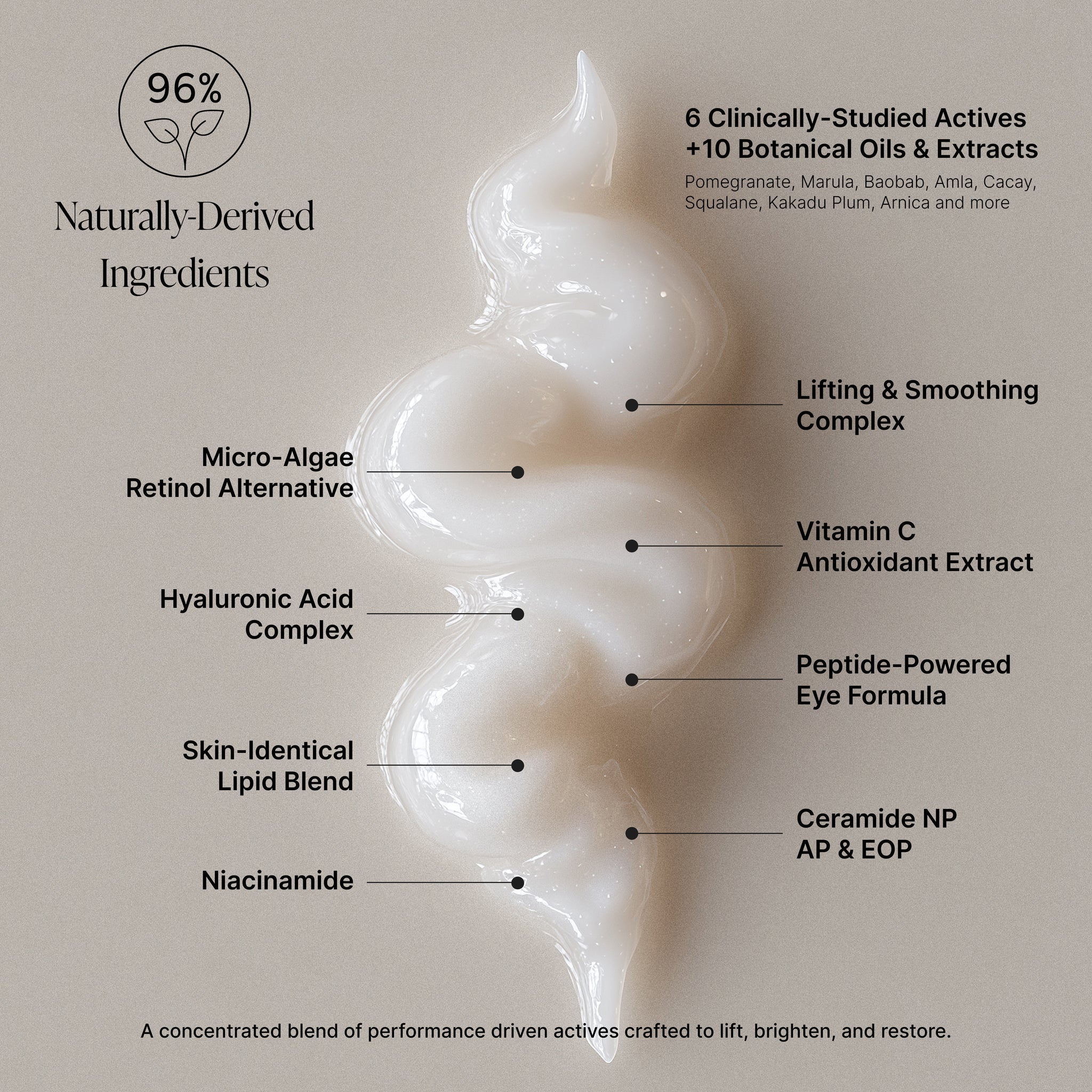 A targeted eye treatment that visibly lifts, smooths, and brightens. Powered by peptides, a retinol alternative, hyaluronic acid, and ceramides to hydrate, depuff, and strengthen the delicate eye area.