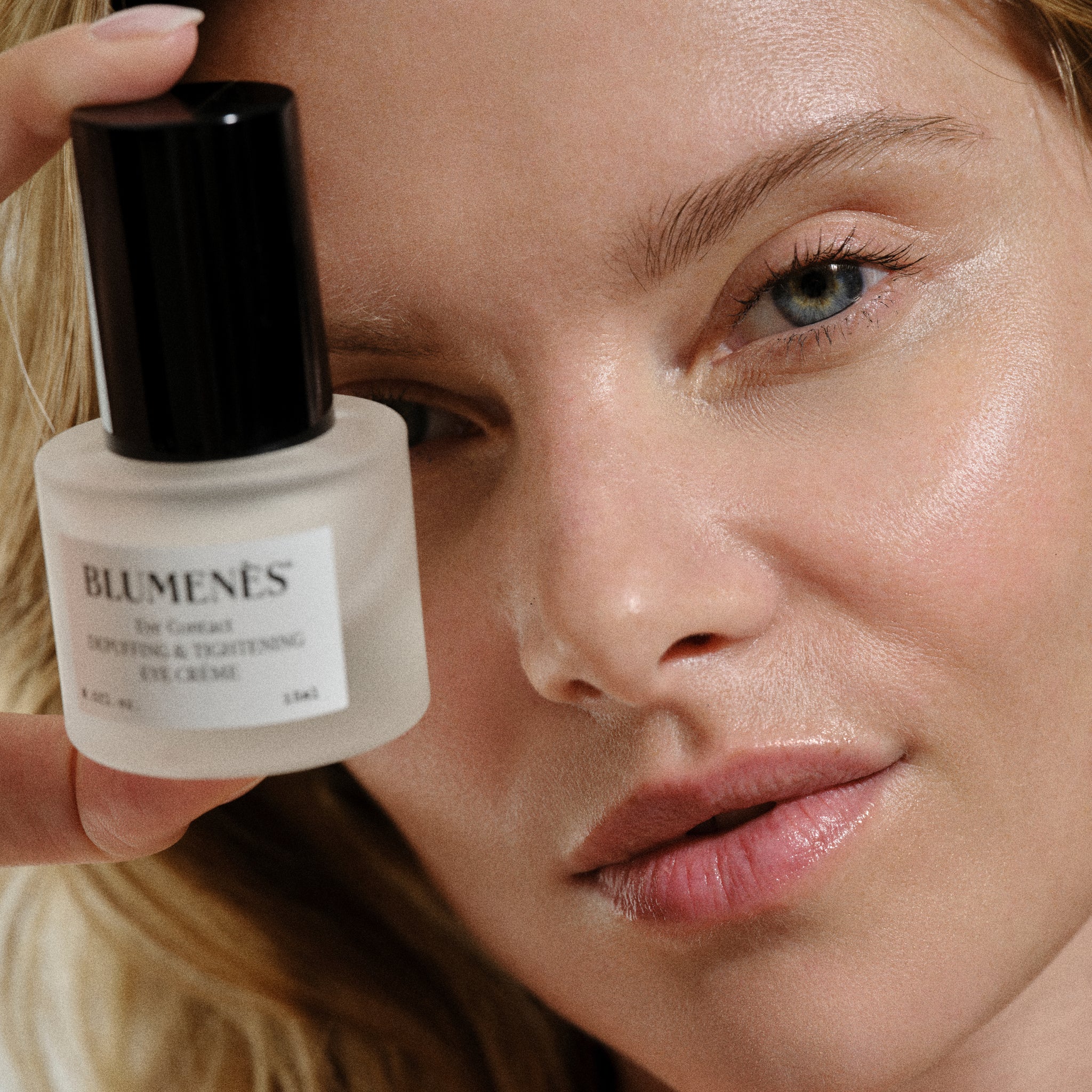 Apply a small amount to your ring finger and gently pat around the orbital bone area, taking care not to pull the delicate skin. Use morning and night for maximum hydration and protection. For enhanced results, follow up with other Blumenes skincare products to complement the eye cream’s effects.