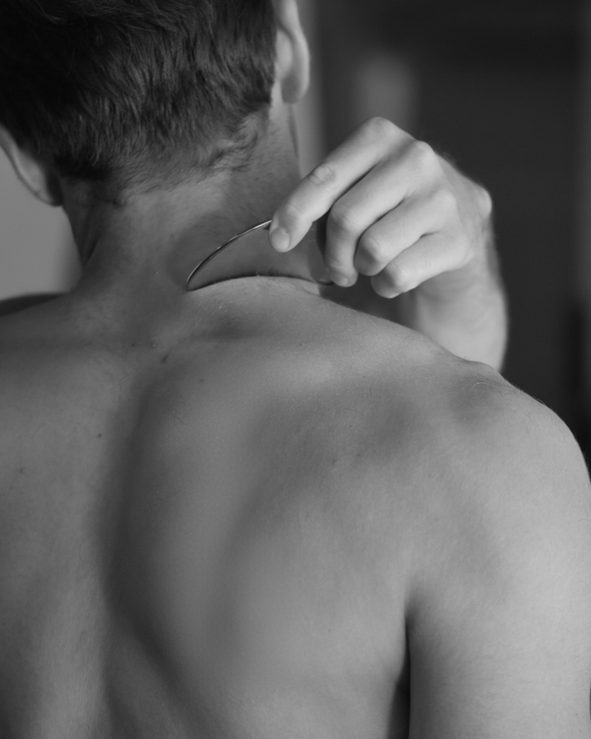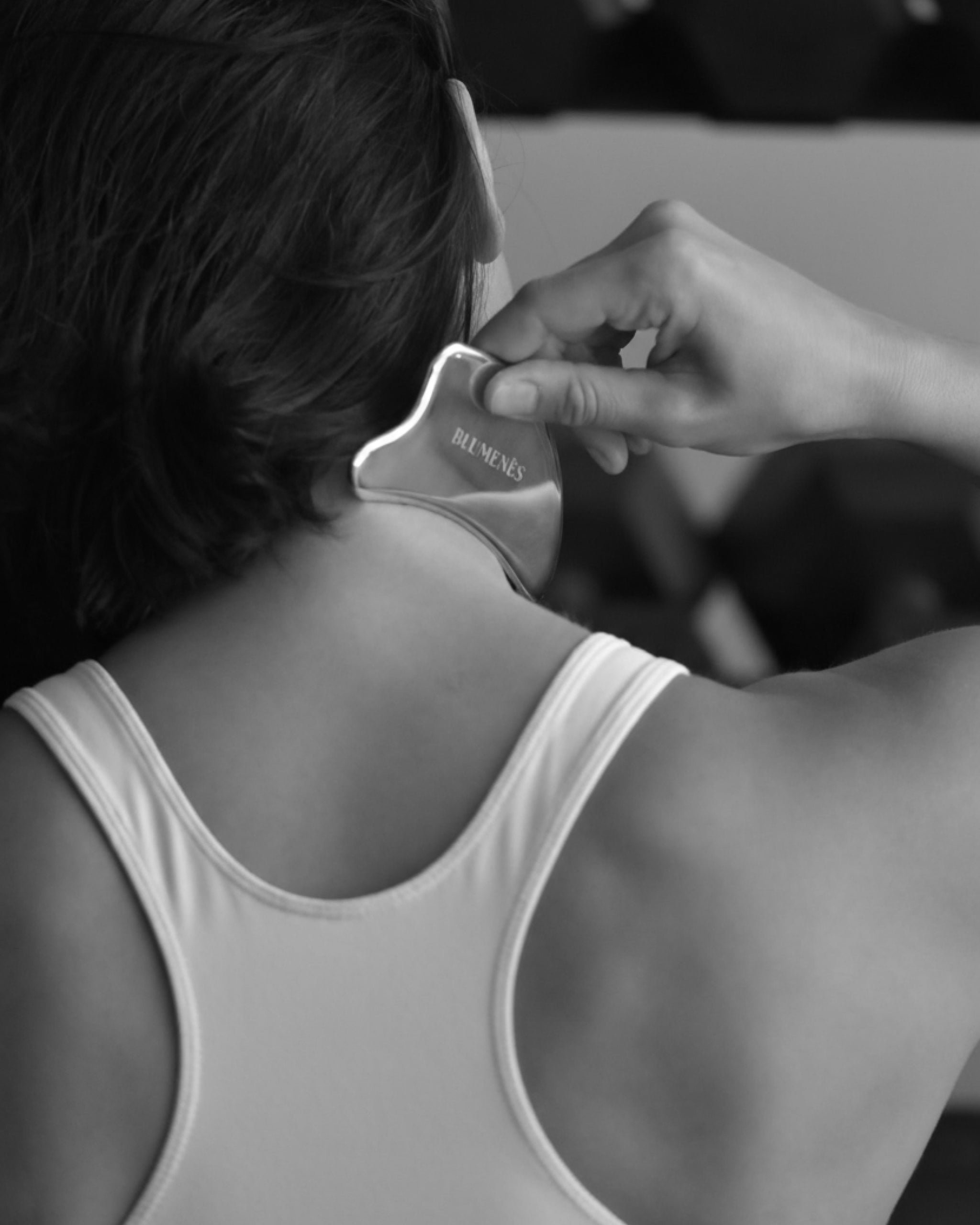 A traditional gua sha tool is most effective with gentle, outward strokes following the natural direction of lymphatic drainage. For the face, this typically means using upward and outward motions, starting from the center of the face and moving outward toward the hairline. On the neck, you should use downward strokes to promote drainage.